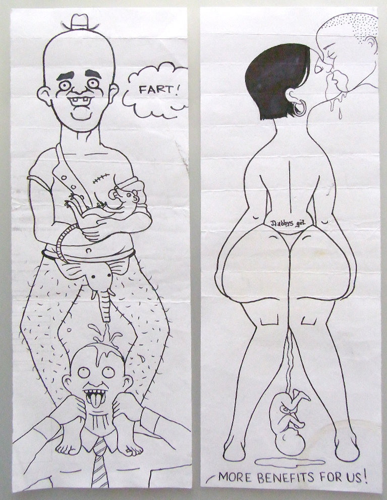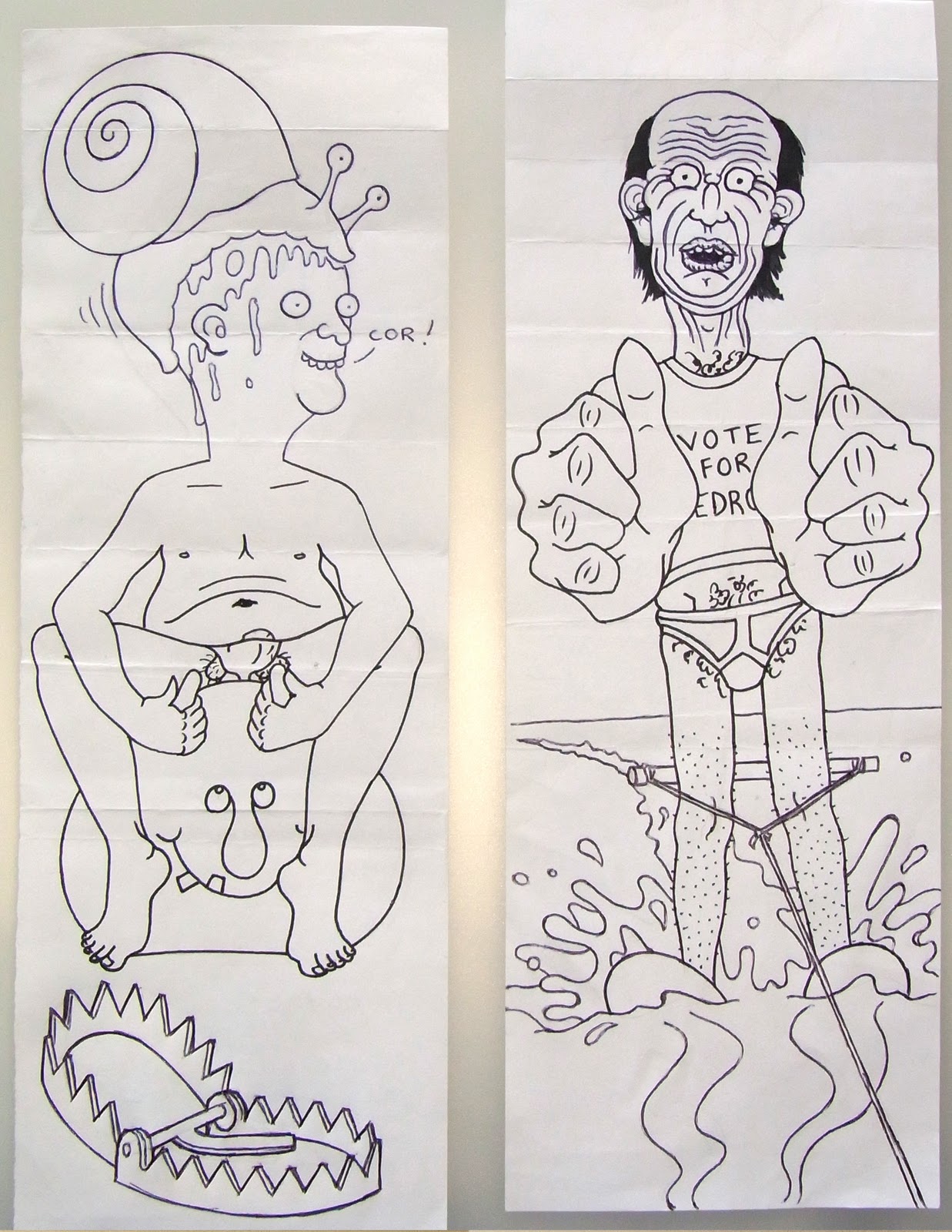 PETER PENCIL & LORD SPALEX PRESENT: HEADS BODIES AND LEGS - A game played with 2 or more participants, pens and paper. Players draw a head at the top of their paper, fold over, so that the stub of a neck can be seen, and exchange. Players continue from the neck, drawing the body section and again folding paper so that the tops of the thighs/or kneecaps remain visible. Drawings pass around again and are finished with legs.